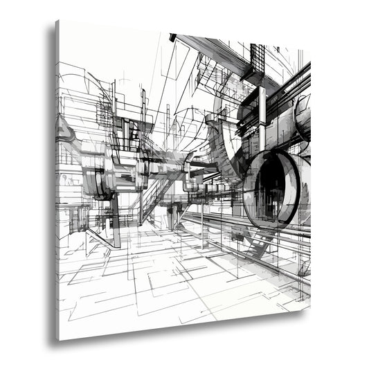 Leinwandbild Technische Linienwelt aus Rohren und Architektur