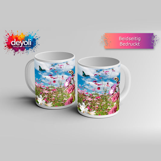 Motivtasse Blütenmeer tanzt mit Schmetterling im Hauch des Sommers.
