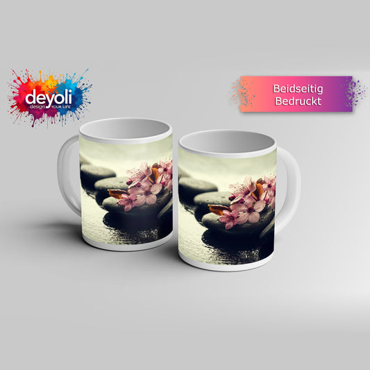 Motivtasse Blüten auf Stein – zarte Ruhe in nasser Stille.