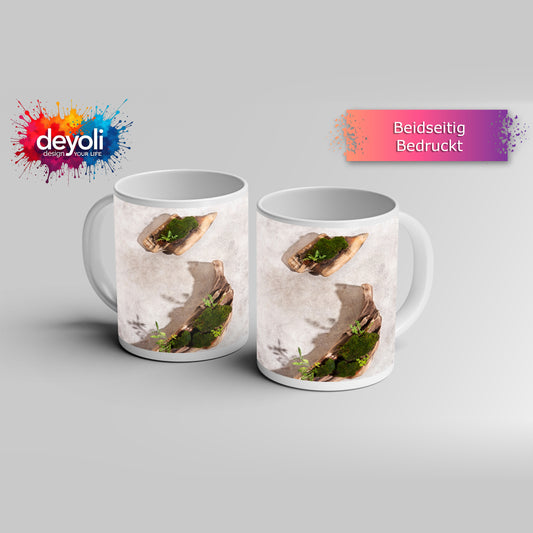 Motivtasse Zen trifft Design – Moosgarten auf Treibholz.