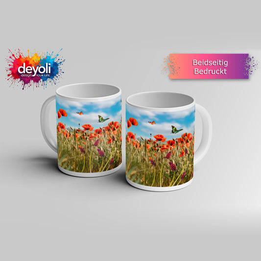 Motivtasse Sommerwiese tanzt im Wind mit Schmetterlingskuss.