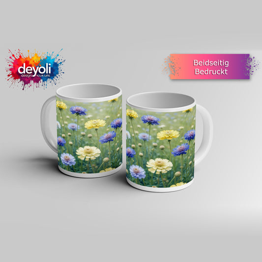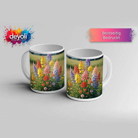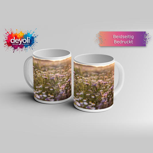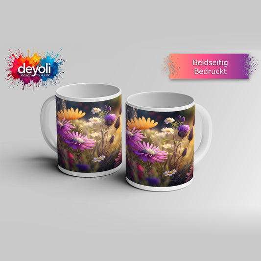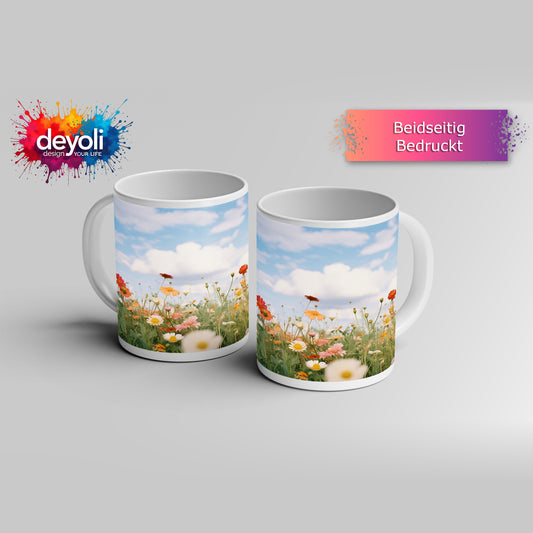 Motivtasse Blütenfeuerwerk in voller Pracht auf grüner Wiese.