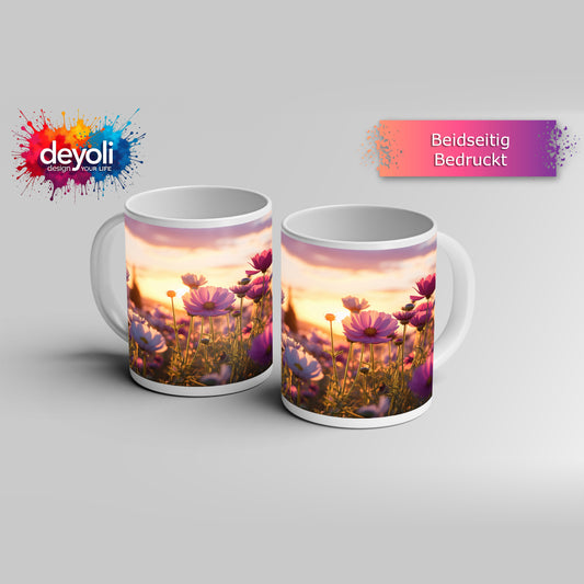 Motivtasse Sonnenuntergang küsst ein Meer aus zarten Kosmeen.