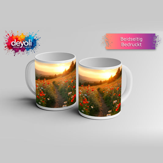 Motivtasse Ein Pfad aus Licht durch ein Mohnblumenmeer im Abendgold.