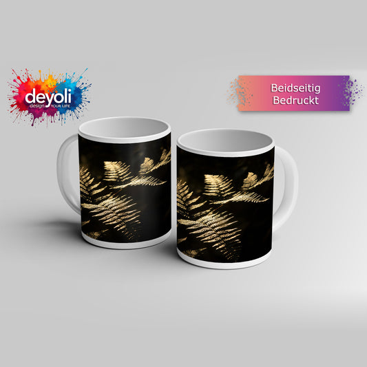 Motivtasse Farn im Licht – Naturpoesie auf dunkler Bühne.