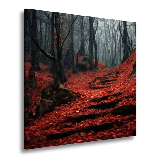 Leinwandbild Herbstwald XXL – Nebliger Pfad bedeckt von flammend rotem Laub