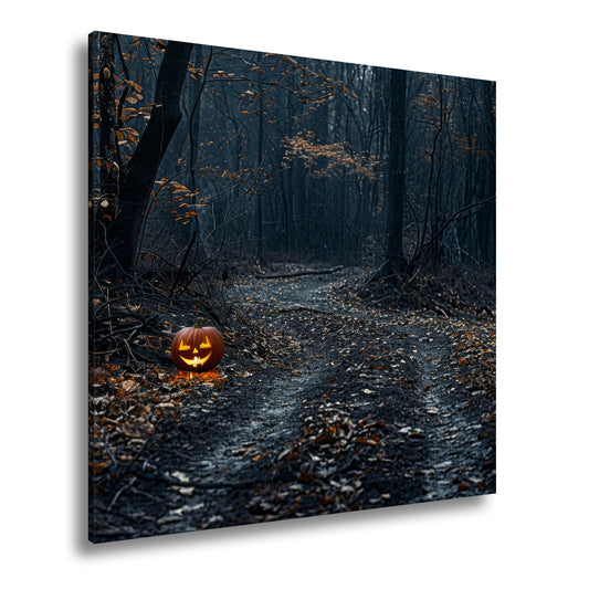 Leinwandbild Kürbis XXL – Grinsen leuchtet durch dunklen Forstweg