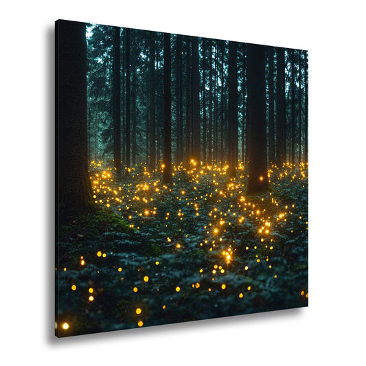 Leinwandbild Glühwürmchen tanzen im tiefen Waldlicht