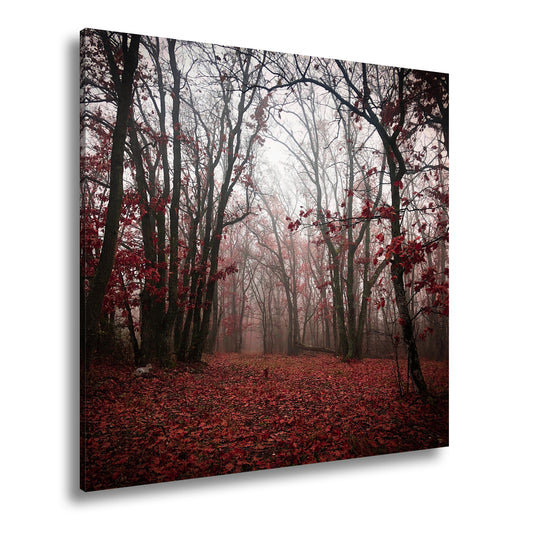 Leinwandbild Herbstwald XXL – Mystisch im roten Nebelschleier gehüllt