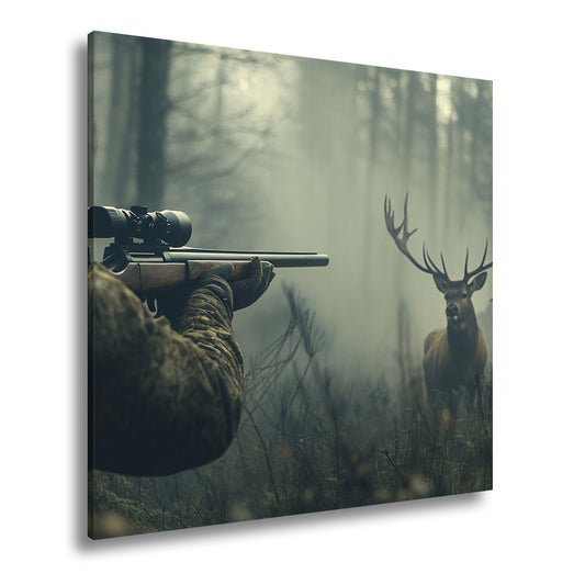 Leinwandbild Jäger XXL – Im Nebel visiert den stolzen Hirsch an