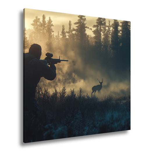 Leinwandbild Jäger XXL – Sonnennebel umhüllt vor scheuen Wildtieren