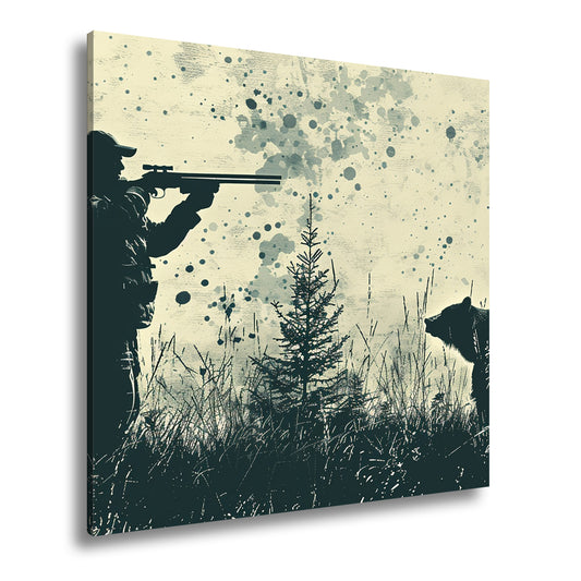 Leinwandbild Jäger XXL – Silhouette trifft auf mächtigen Bären im Wald