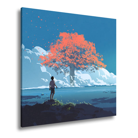 Leinwandbild Ein Junge staunt vor einem glühenden Baum im Meer aus Licht