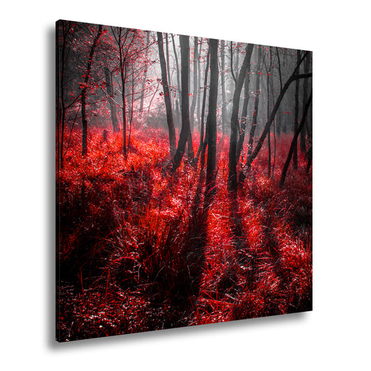 Leinwandbild Mystischer Wald, rot glühendes Gras im Nebelschimmer