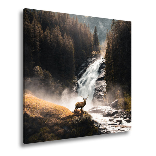 Leinwandbild Hirsch vor tosender Wasserfallkulisse