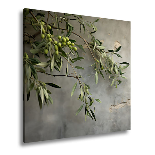 Leinwandbild Zarter Olivenzweig vor verwitterter Wandpoesie