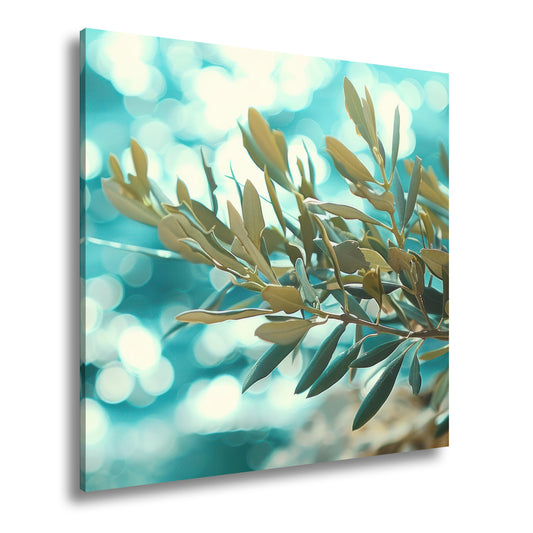 Leinwandbild Olivenzweige vor glitzerndem Wasser in sanfter Sommerstimmung