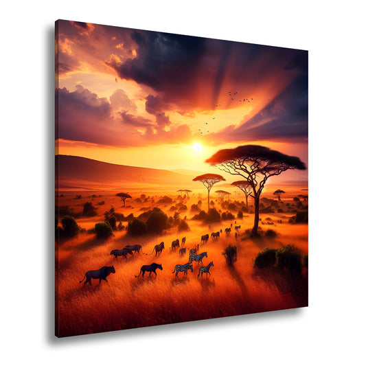Leinwandbild Zebras ziehen durch flammende Savanne im Abendlicht.