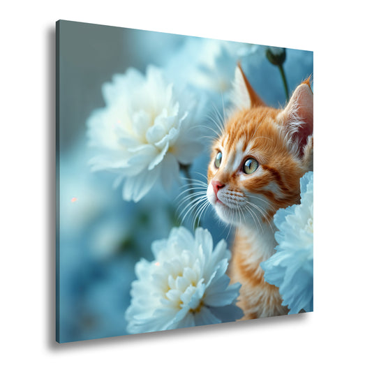 Leinwandbild Samtpfote im Blütenmeer – zarte Ruhe in Blau und Gold.