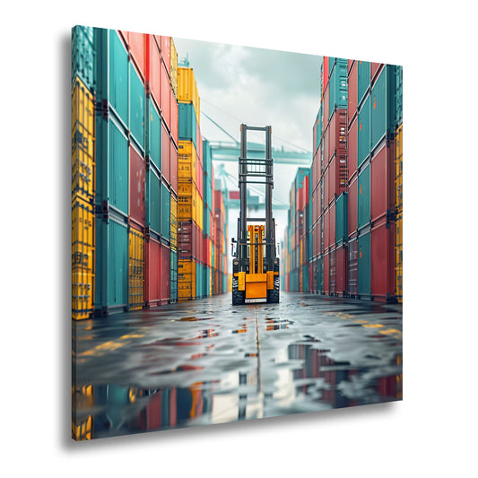 Leinwandbild Gabelstapler zwischen bunten Containern XXL – Industrie Wandbild