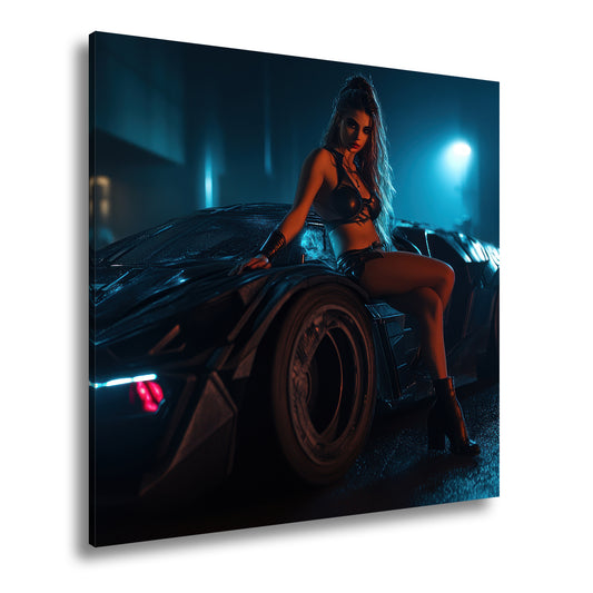 Leinwandbild Frau mit Sportwagen – Futuristisches Auto XXL Wandbild