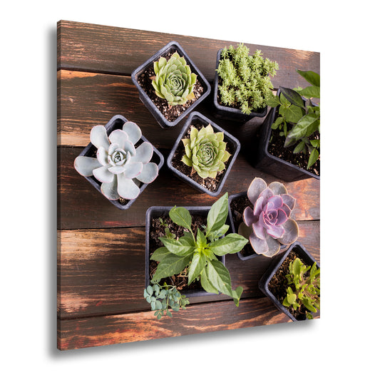 Leinwandbild Grüne Vielfalt in stilvollen Töpfen auf rustikalem Holz XXL – Pflanzen