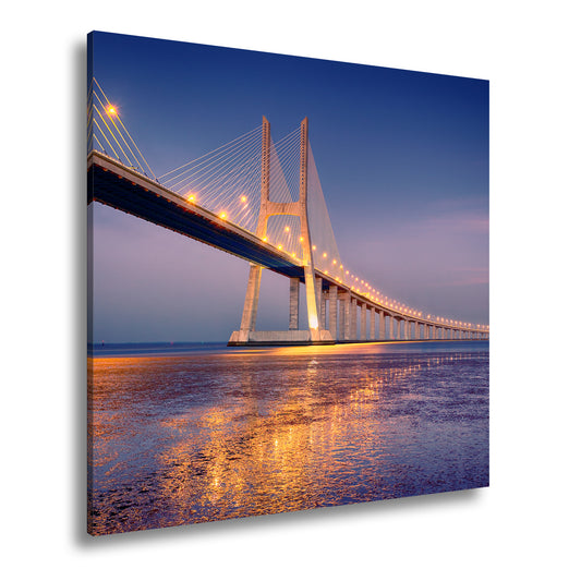 Leinwandbild Goldenes Leuchten über Brücke bei ruhigem Abendmeer XXL – Landschaft