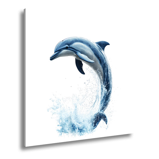 Leinwandbild Sprung aus dem Meer – ein Delfin tanzt im weißen Nichts.