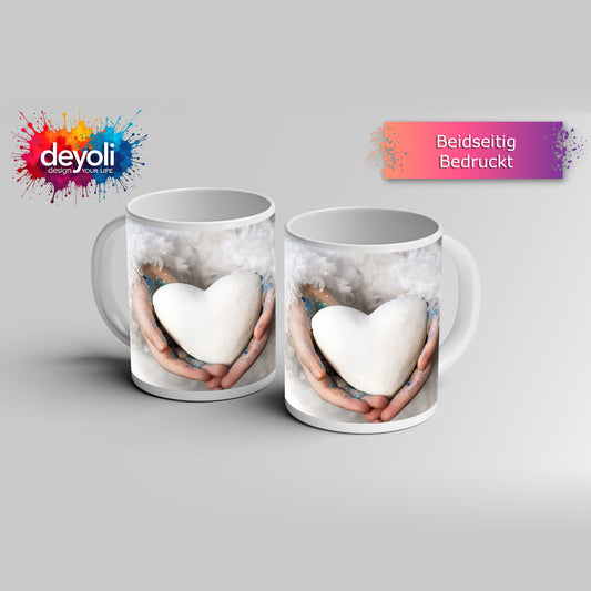 Motivtasse Ein Herz in Händen – gehalten mit Glitzer und Sanftmut.