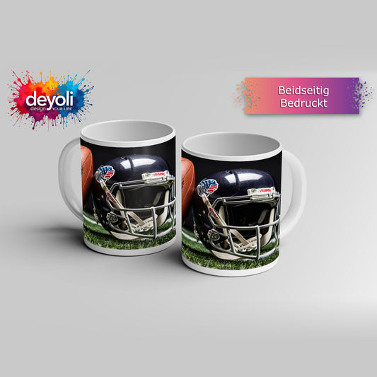 Motivtasse Helm und Ball – bereit fürs große Spiel.