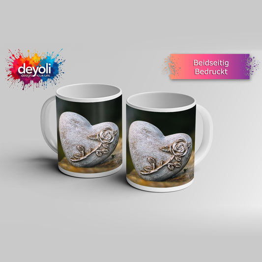 Motivtasse Herz aus Stein – verziert mit einer Rose der Erinnerung.