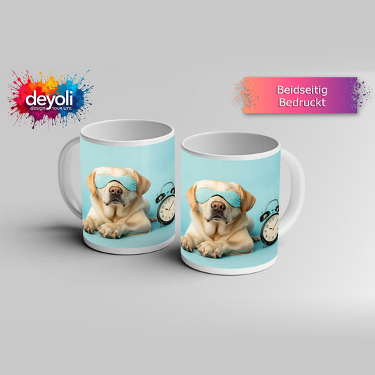 Motivtasse Schlummernder Hund – Traumstunde trifft Weckerstil.