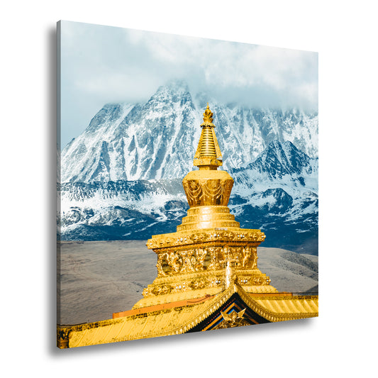 Leinwandbild Goldene Stupa glänzt vor eisiger Bergpracht im Himmelstor.