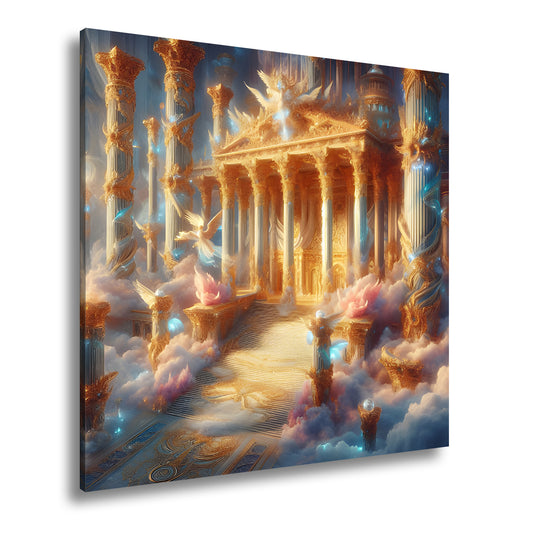 Leinwandbild Himmlischer Palast aus Licht, Gold und schwebenden Engeln.