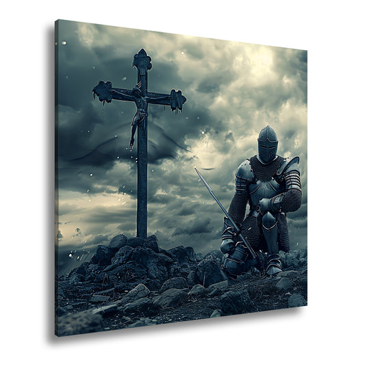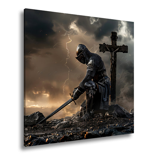 Leinwandbild Ritter kniet am Kreuz – ein Schwur im Sturm der Ewigkeit.