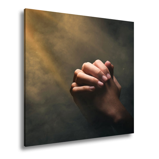 Leinwandbild Hoffnungsvoll gefaltete Hände im Lichtstrahl – XXL