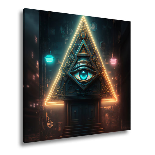 Leinwandbild Allsehendes Auge XXL – Leuchtend in mystischer Dreiecksfassade