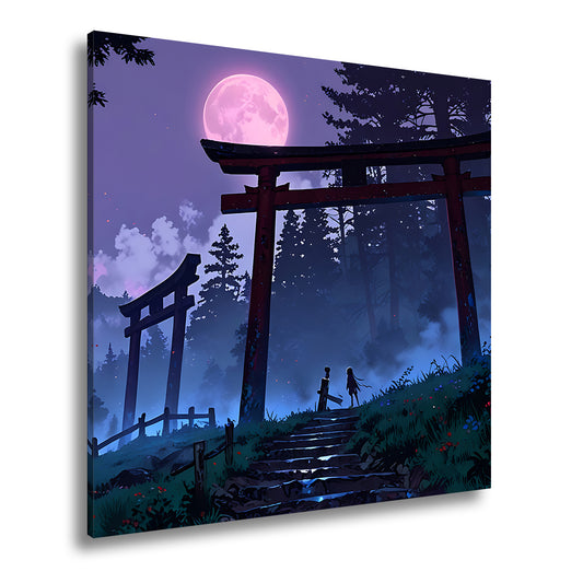 Leinwandbild Torii im Nebel, zwei Gestalten unter dem violetten Mond.