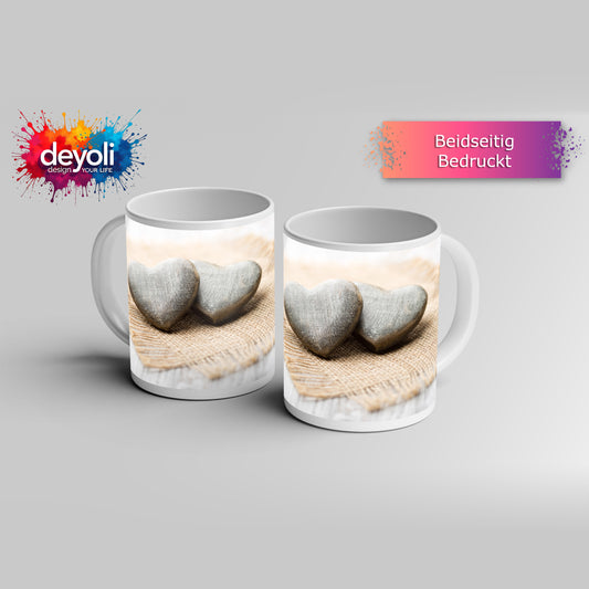 Motivtasse Zwei Steinherzen ruhen auf sanftem Leinengewebe.