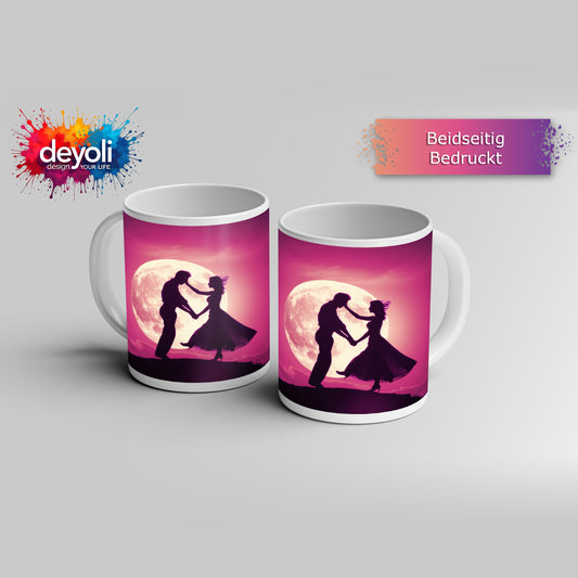 Motivtasse Tanz der Liebe vor dem Mond in rosafarbener Nacht.
