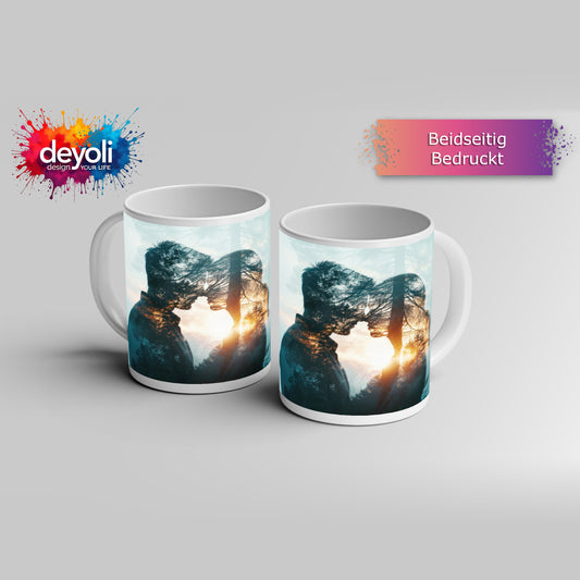 Motivtasse Liebe verwoben im Wald – Licht zwischen Silhouetten.