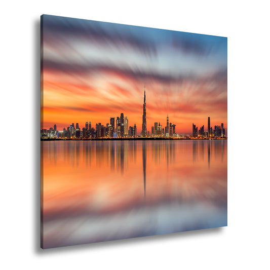 Leinwandbild Dubai XXL – Skyline spiegelt im glühenden Abendhimmel