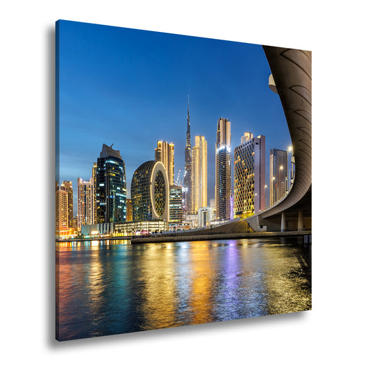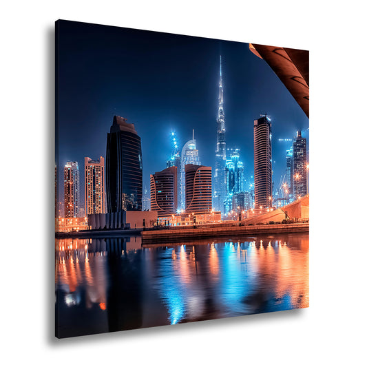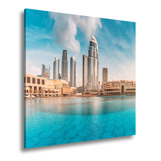 Leinwandbild Glitzernde Skyline spiegelt sich im türkisblauen Wasser Dubais