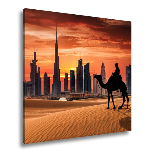 Leinwandbild Wüstensilhouette trifft auf Dubais flammenden Abendhimmel