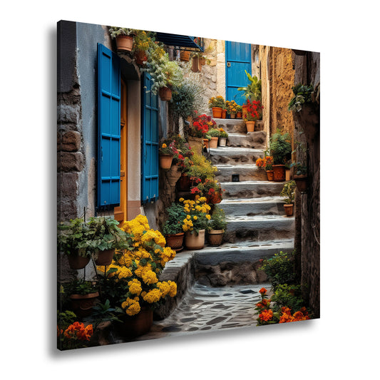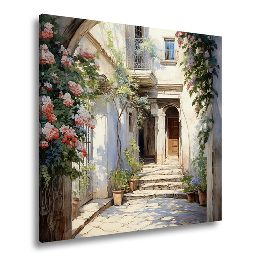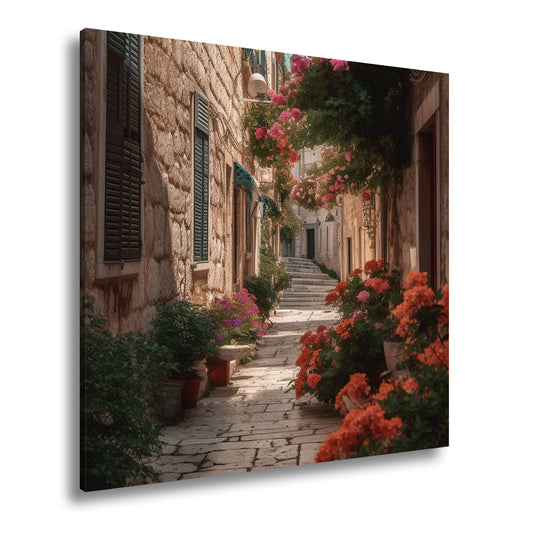 Leinwandbild Verwunschene Gasse voller Blütenpracht und mediterranem Charme