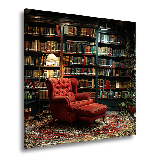 Leinwandbild Gemütliche Bibliothek mit rotem Sessel und warmem Licht