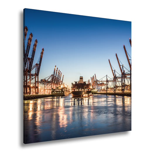 Leinwandbild Glitzernde Hafenlichter zwischen Stahl und Wasser