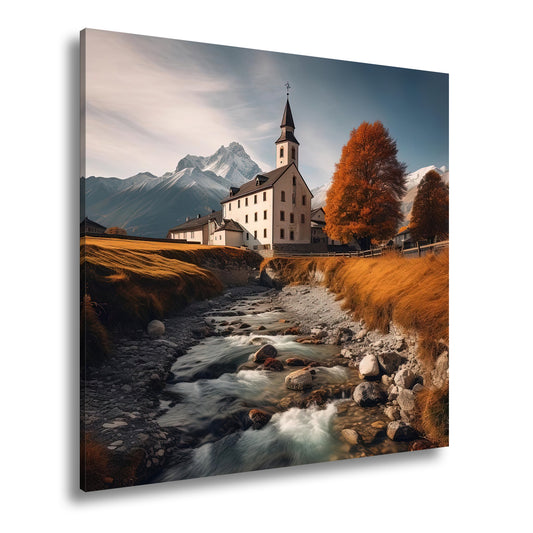 Leinwandbild Alpenkirche wacht über den goldenen Strom des Herbsts.