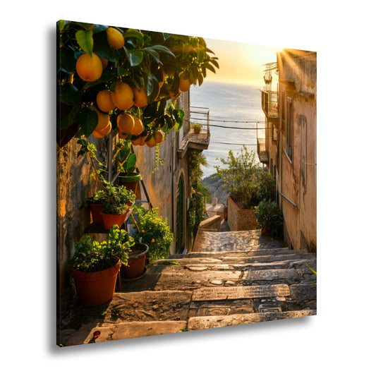 Leinwandbild Sonnenverwöhnte Stufen führen zum Meer durch mediterrane Gassen