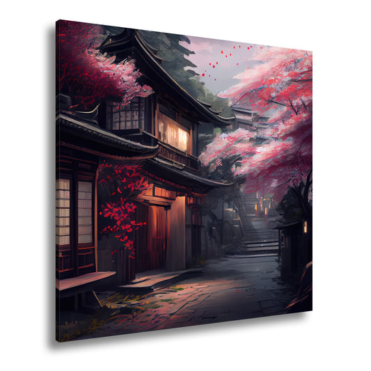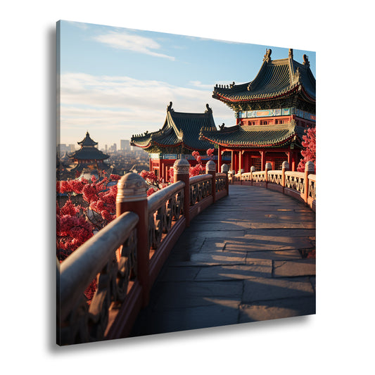 Leinwandbild Chinesischer Tempelpfad – Harmonie in Kirschblütenlicht.